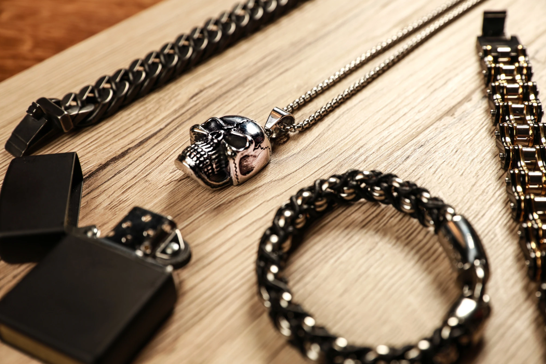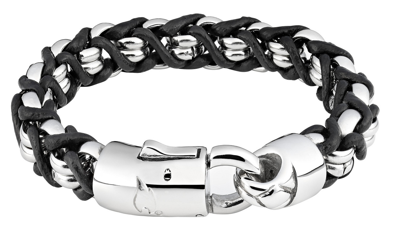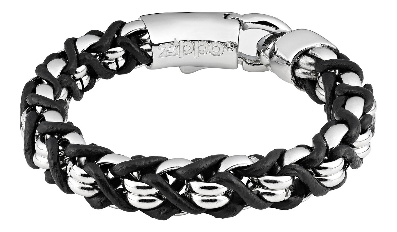Roostevabast terasest, rõngastest ja nahast nööridega käevõru. Zippo logo kaunistab luku sisemust. Mõõdud: 20 x 1,1 x 1 cm. Kinkekarbis.